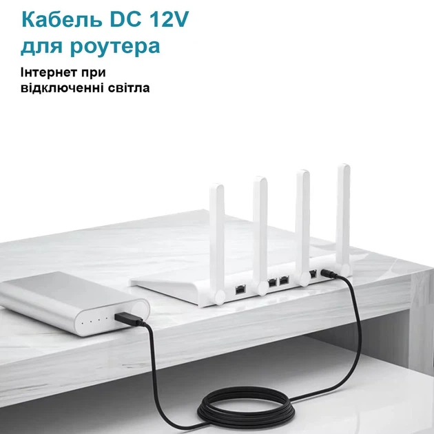 Кабель живлення з виходом 12V DC для роутера, який працює від повербанка, дозволяє продовжувати використовувати інтернет під час відключення електрики, за умови, що провайдер продовжує подавати сигнал.